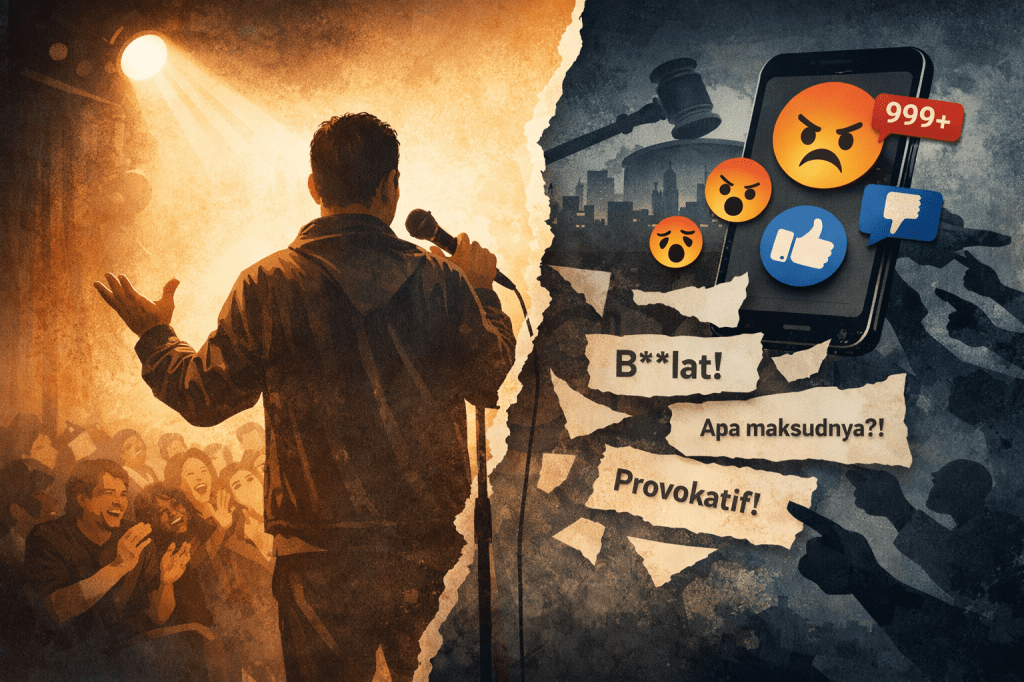 Masalah muncul ketika materi tersebut keluar dari panggungnya. Potongan pendek tanpa pengantar, tanpa konteks, dan tanpa penjelasan arah kritik membuat sebagian publik menangkapnya sebagai pernyataan harfiah. Satire dibaca sebagai sikap pribadi. Ironi dianggap pembenaran. Di titik inilah niat komedi terlepas dari makna yang sampai ke publik. Mens rea yang mungkin kritis dan reflektif tenggelam oleh tafsir yang emosional.